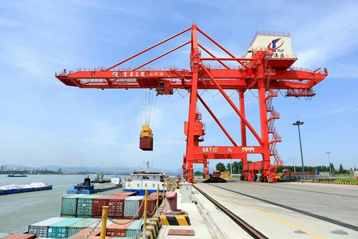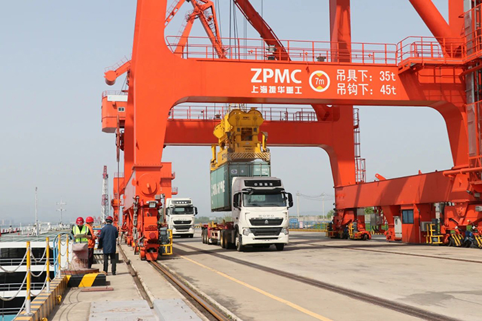 春陽高照,江天一色。一臺巨大的岸邊橋式起重機緩緩將一個個集裝箱從??吭诮叺牧χ迖H貨輪上吊起,穩(wěn)穩(wěn)放在停在碼頭棧橋上的轉(zhuǎn)運車上。一輛車開走駛向貨場,下一輛迅即補位。