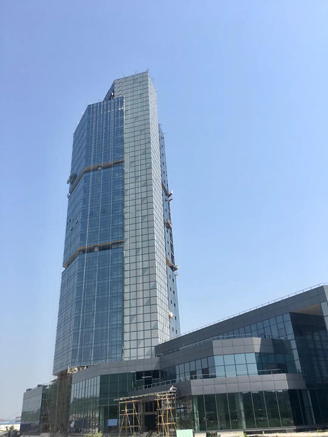 在高99米、建筑層數(shù)25層的宜昌高新區(qū)白洋港口新區(qū)地標(biāo)項目——三峽航運大廈大樓上,27名身系安全繩的工人正在16層、19層吊籃上安裝玻璃幕墻。